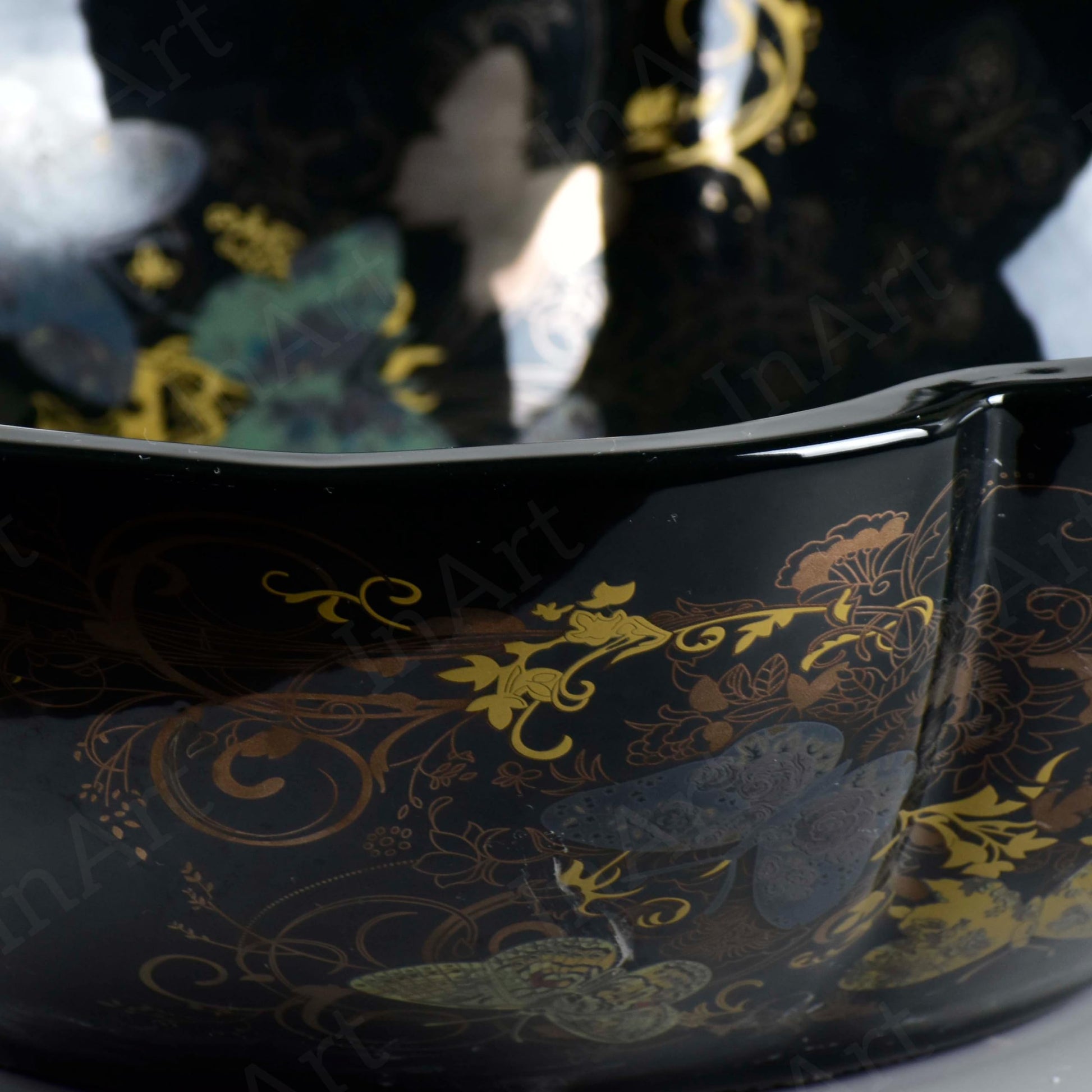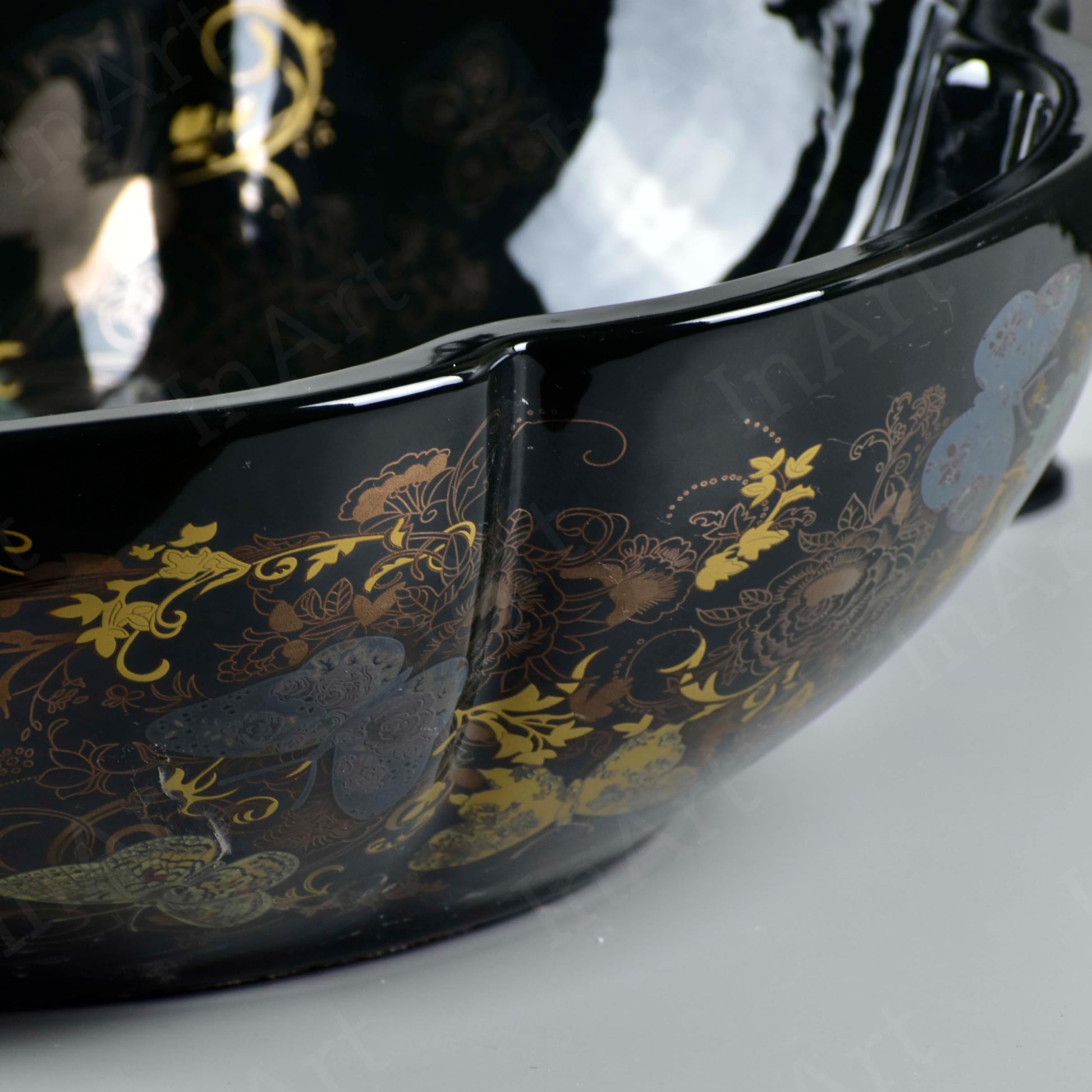 تبدأ أحواض الغسيل المخصصة لتجديد الحمامات بقطعة مميزة - يتميز هذا الوعاء المستدير المصنوع من السيراميك الأسود اللامع بنمط زهري على شكل فراشة ذهبي متعدد الألوان يضفي لمسة جمالية فورية على أي سطح من أسطح الحمامات.