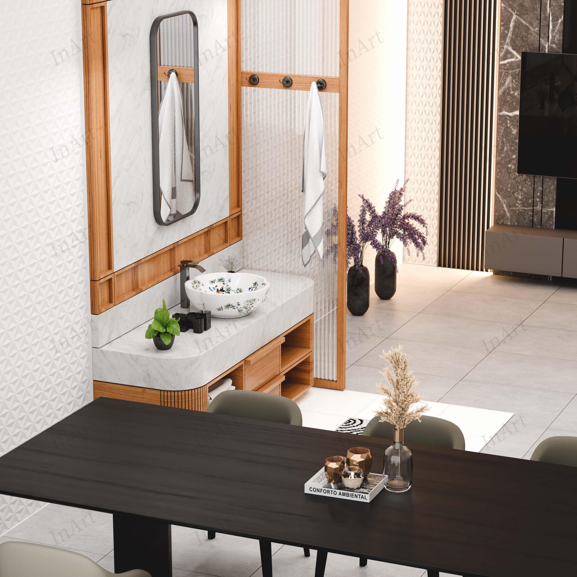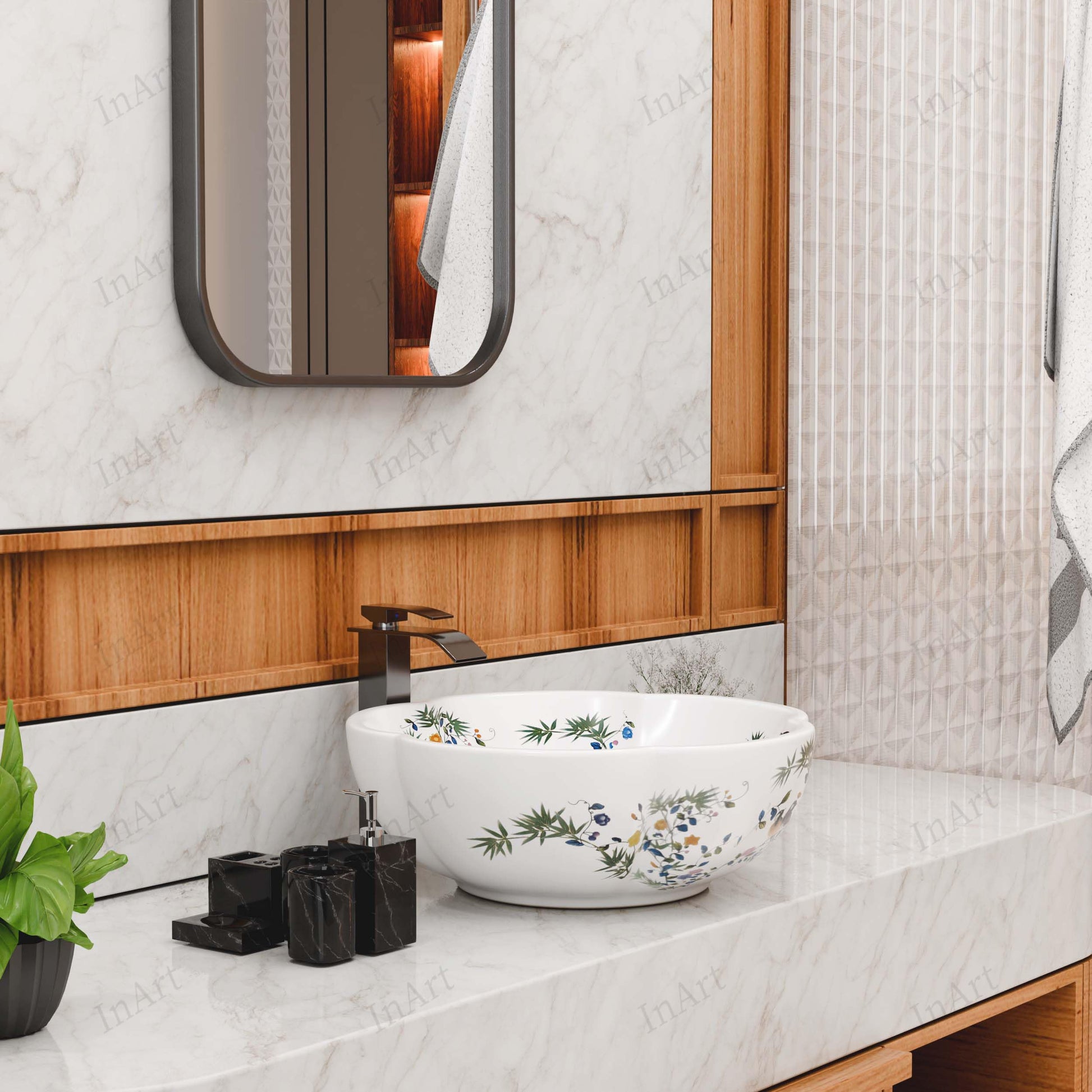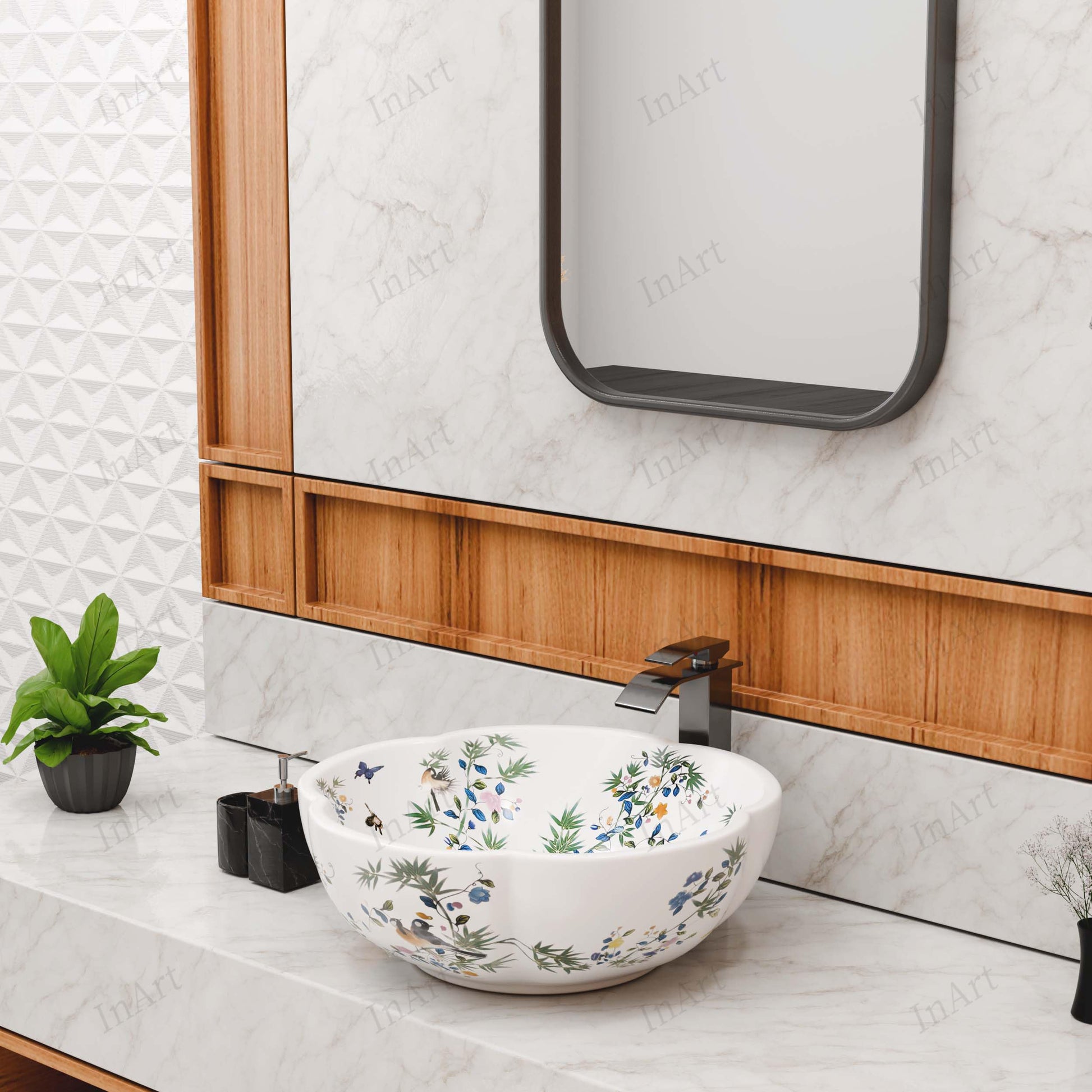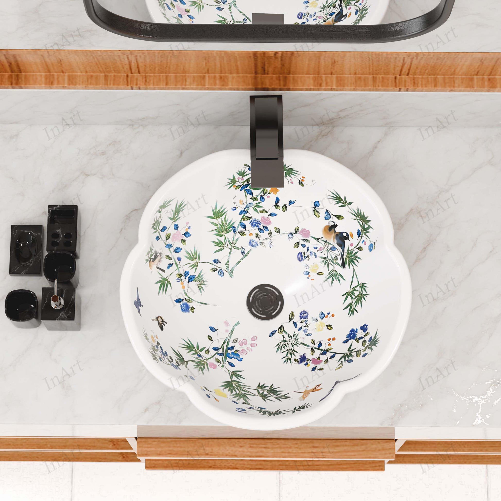 يجب أن تبدو أحواض الغسيل المخصصة لتجديد الحمامات وكأنها قطعة فنية عملية - يتميز هذا الحوض الخزفي الأبيض اللامع بحافة مزخرفة ونقوش زهرية وطيور نابضة بالحياة تضفي لمسة جمالية فورية على أي سطح من أسطح الحمامات.