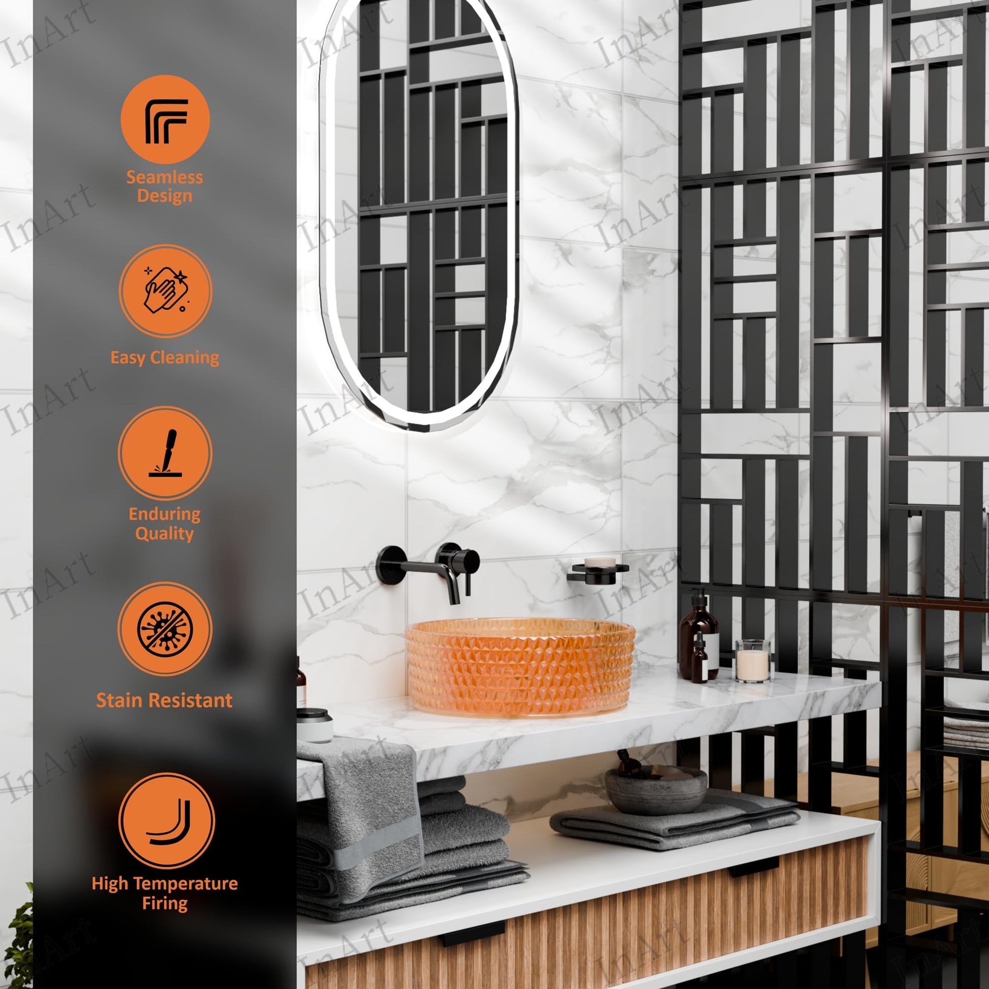 • Cleaning: Wipe with a soft cloth and mild soap; avoid abrasive pads and harsh chemicals to protect the glossy finish.