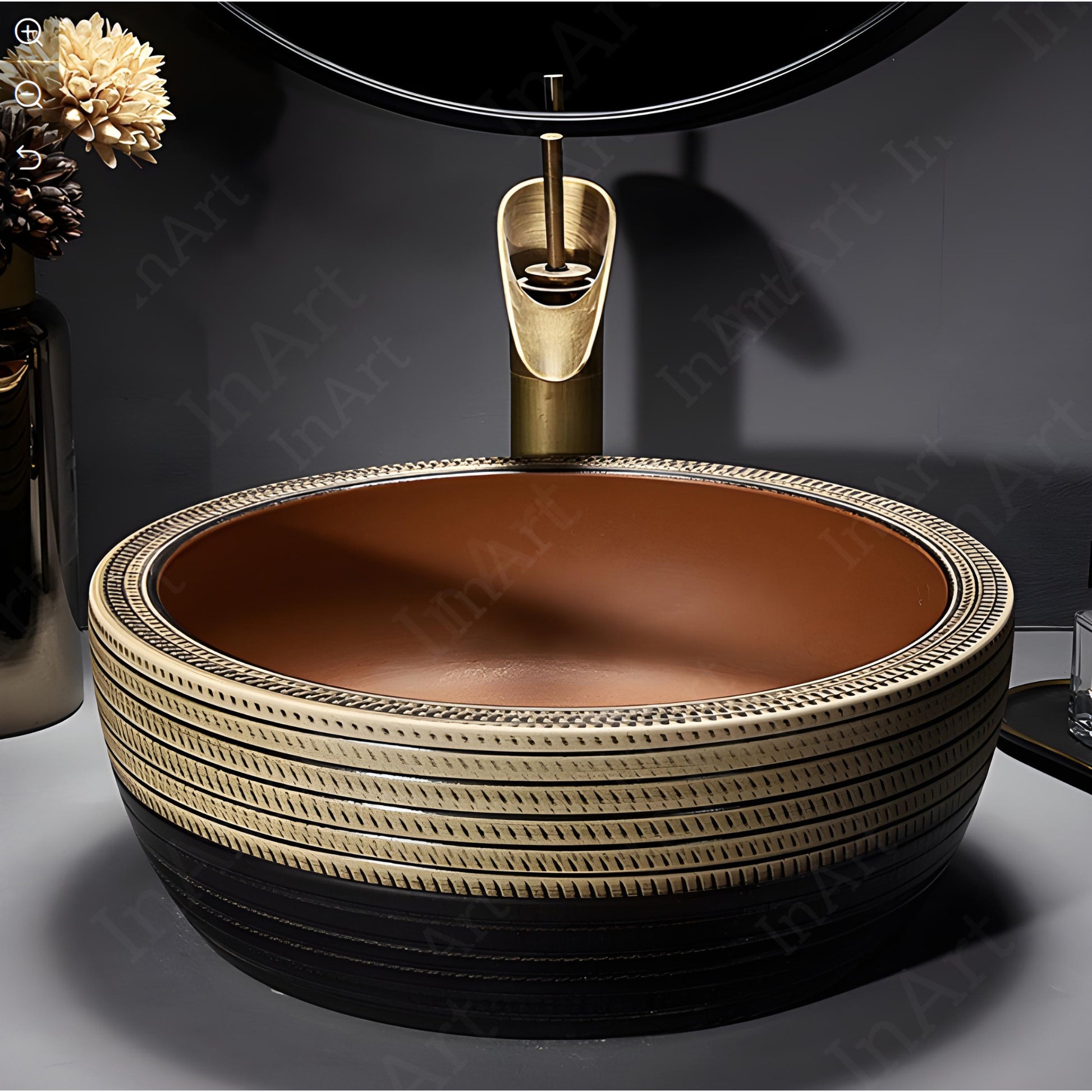 InArt Matte Brown Ceramic Vessel Sink – 16" Round Countertop Bathroom Basin for Home & Hotel DW333