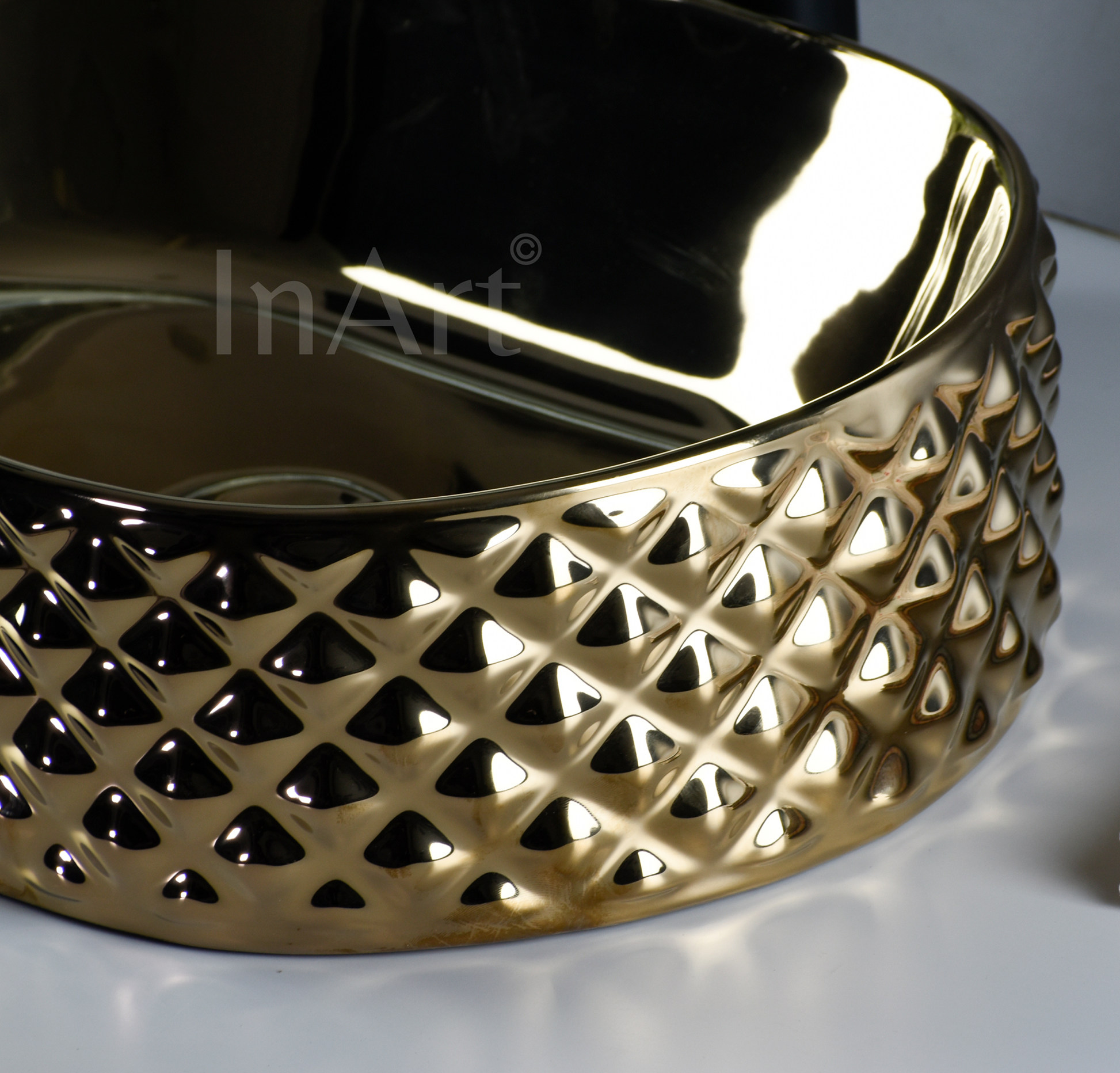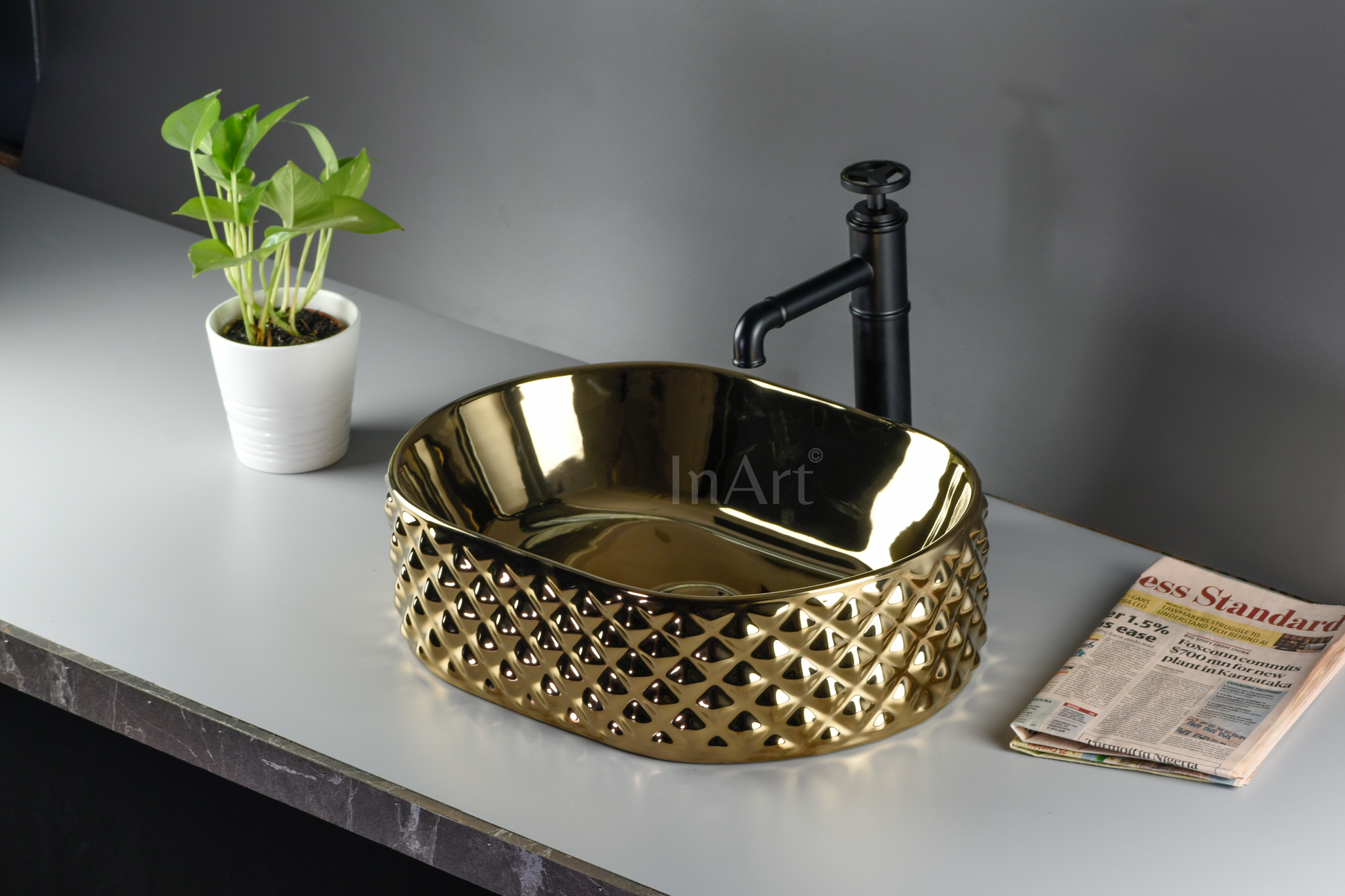 Upgrade your bathroom with the InArt Modern Gold Ceramic Vessel Sink, a luxurious piece that blends functionality with style. With its sleek rectangular design and glossy metallic gold finish, this countertop sink instantly transforms any vanity into a statement of sophistication.