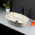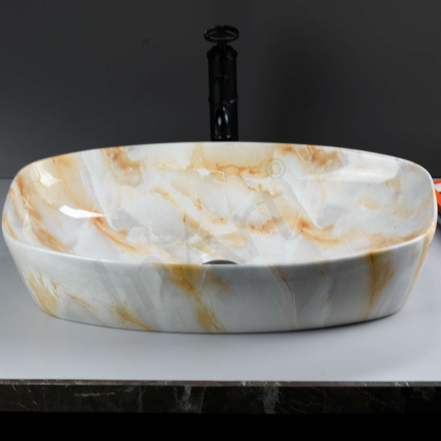 Elevate your bathroom with the InArt Onyx Marble Ceramic Vessel Sink, designed with a glossy marble finish that blends timeless style and modern sophistication. Its rectangular bowl design and sleek edges create a refined centerpiece for any vanity.