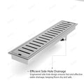 This rectangular linear channel drain is built from brushed AISI 304 stainless steel and installs flush/near-flush in tile or stone. A removable slotted grate and lift-out internal insert make routine cleaning simple, while the integrated odor trap and pest-blocking design help keep your bathroom smelling fresh.