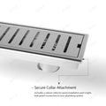 Removable slotted grate cover on 304 stainless steel linear shower floor drain, brushed finish