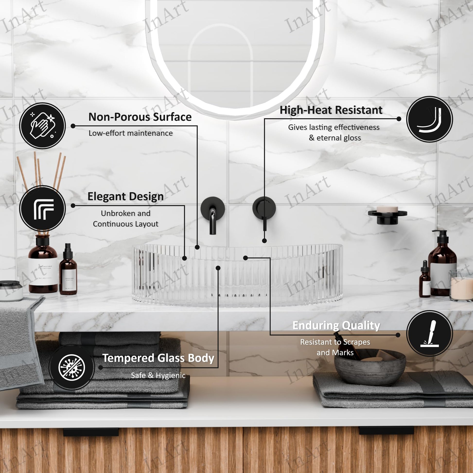 • Fluted ribbed clear glass: Adds depth and sparkle while keeping the space feeling open (transparent design complements stone, quartz, marble, and wood tops).