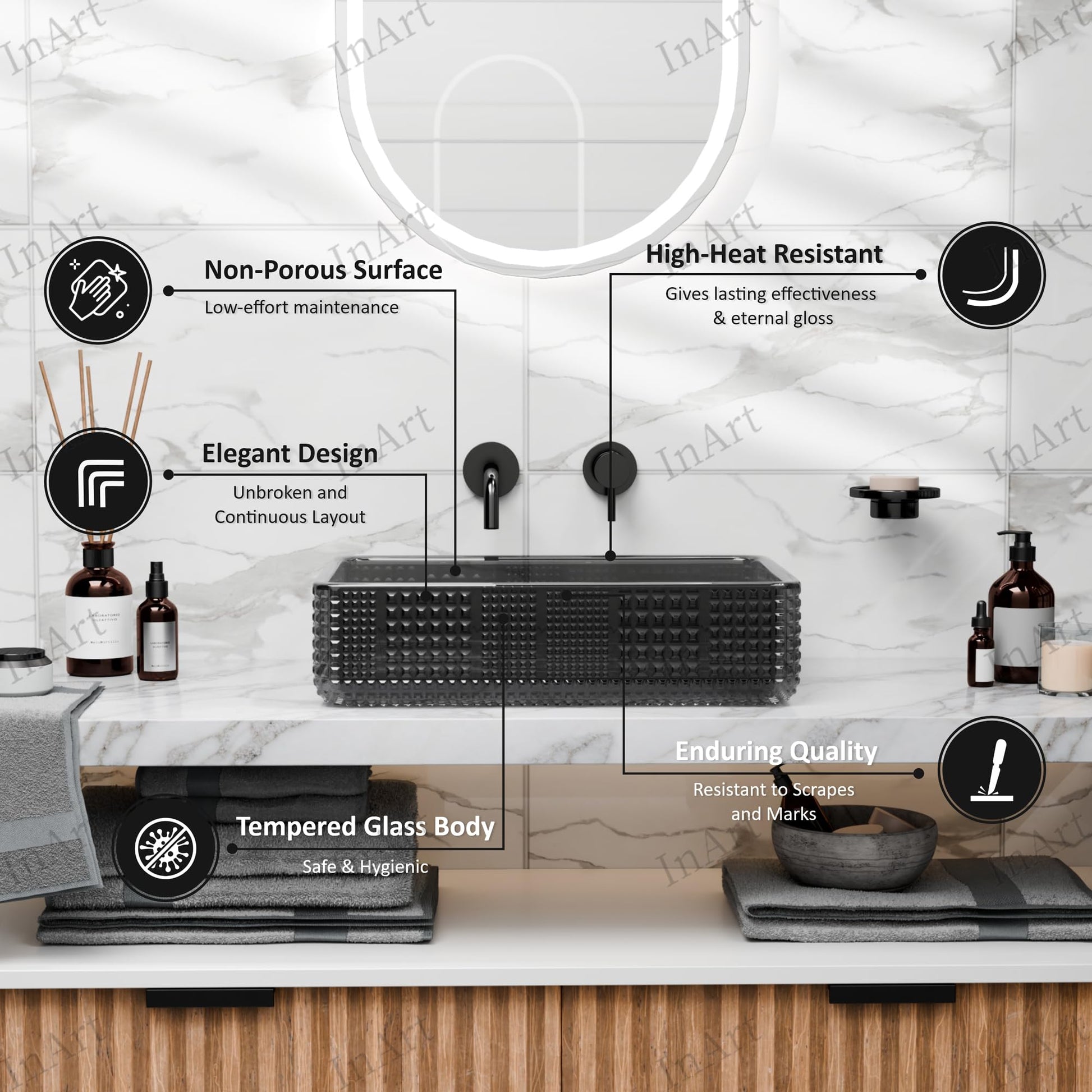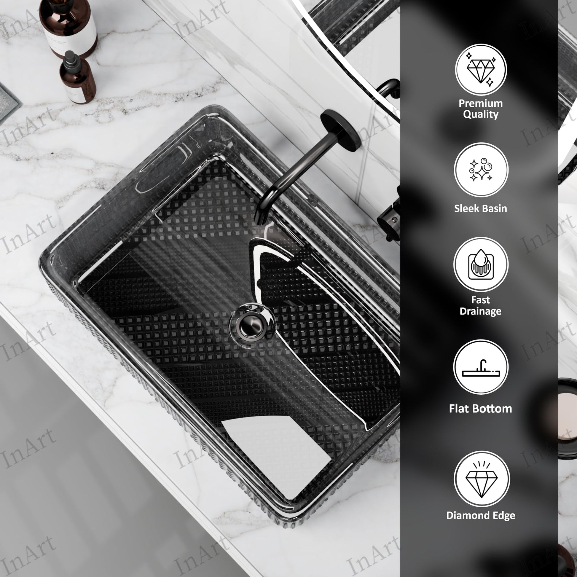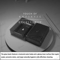 • 1 rectangular tempered glass vessel sink (smoked black, textured)
