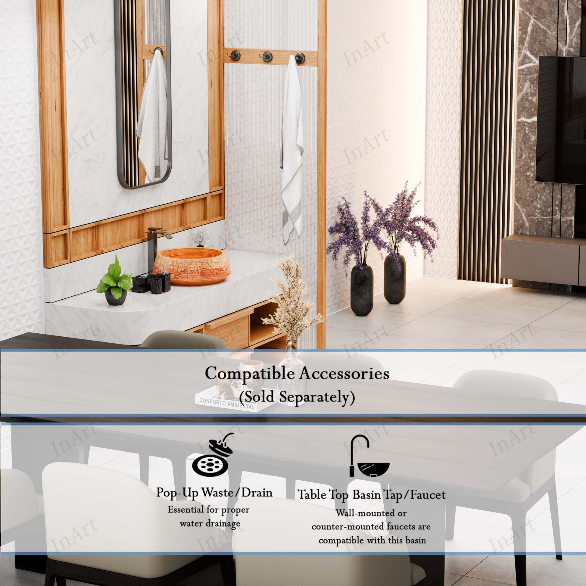 - Countertop fit: Works with most vanity tops (stone, quartz, granite, solid surface, or wood) with an appropriate drain opening.