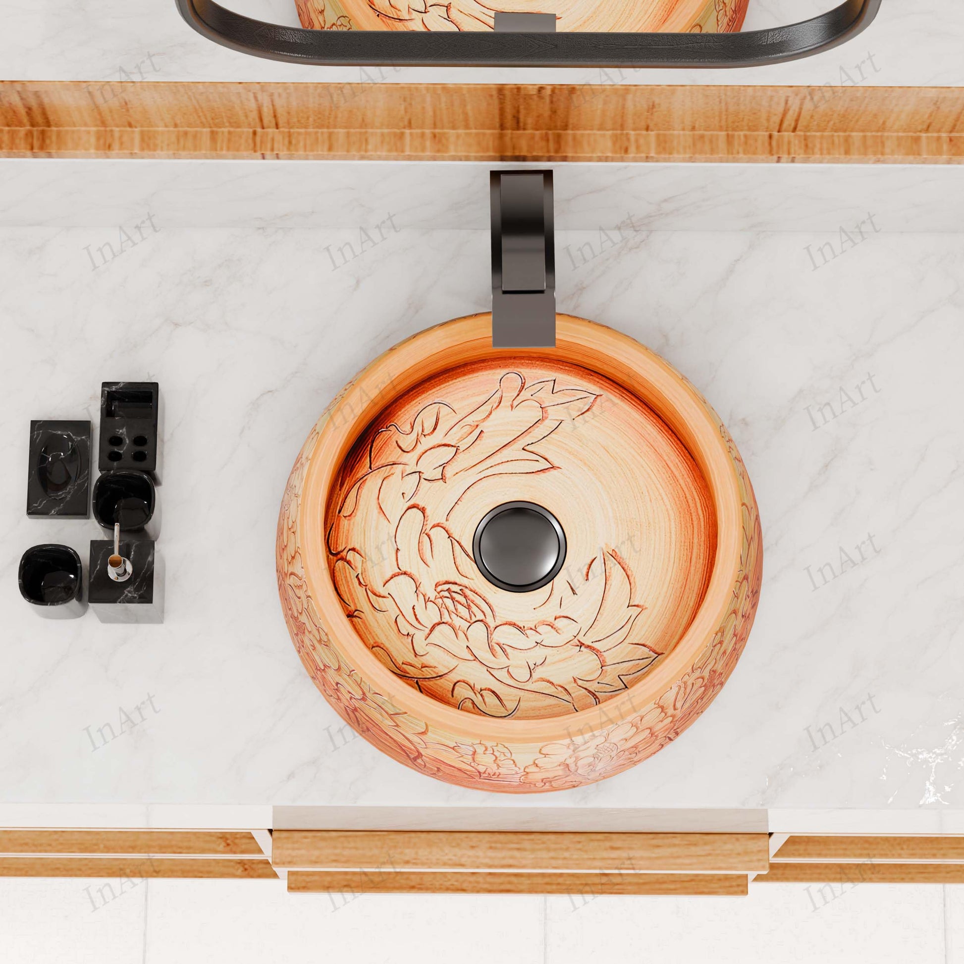 InArt Wood-Tone Ceramic Round Vessel Sink – Floral Art Design, 16.5"