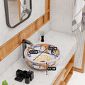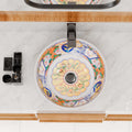 Round ceramic vessel sink with glossy white base and multicolor Mexican/Moroccan pattern, above-counter bathroom bowl
