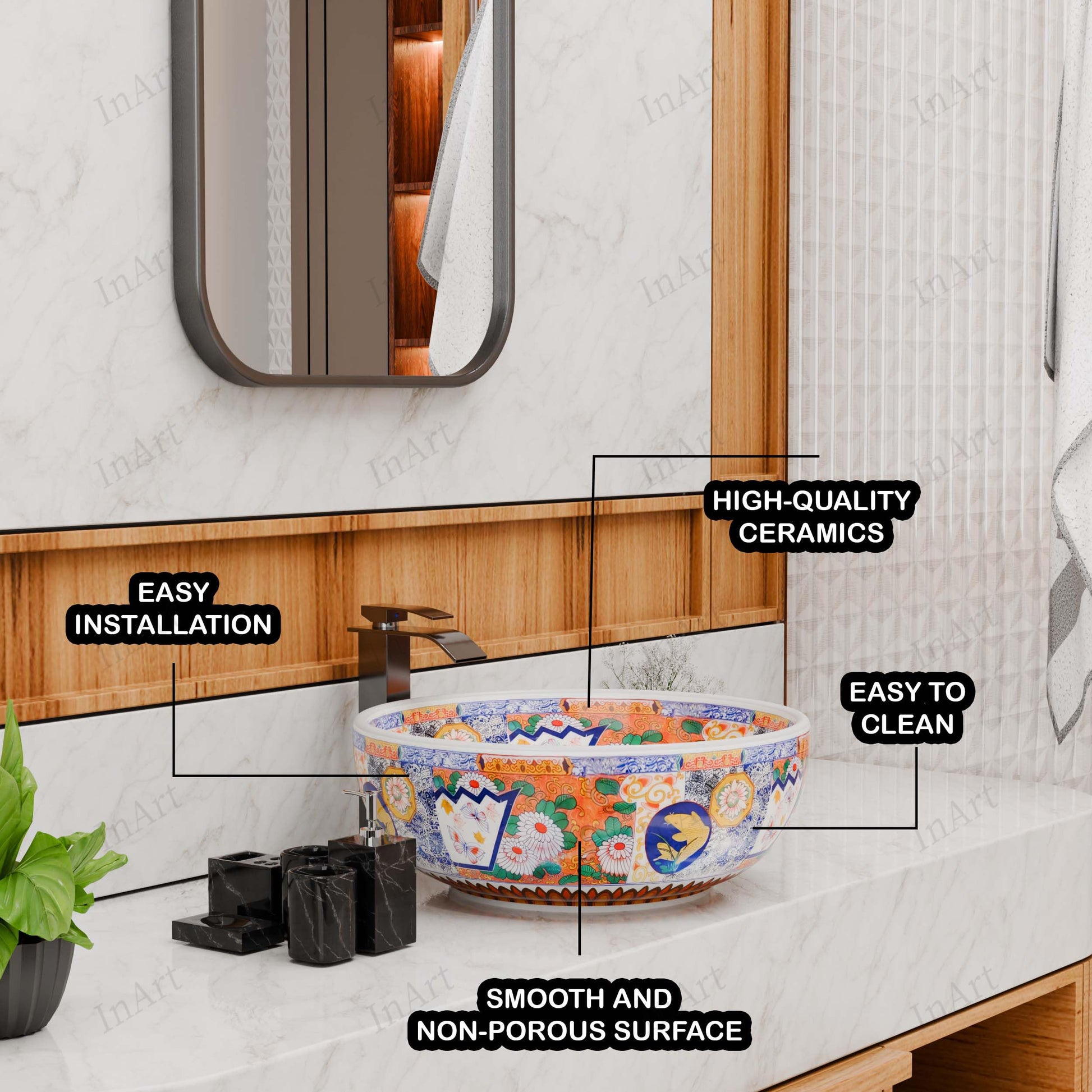 • Faucet flexibility: No faucet holes—pair with a wall-mount or countertop-mounted faucet to match your vanity layout (clean, modern rim).