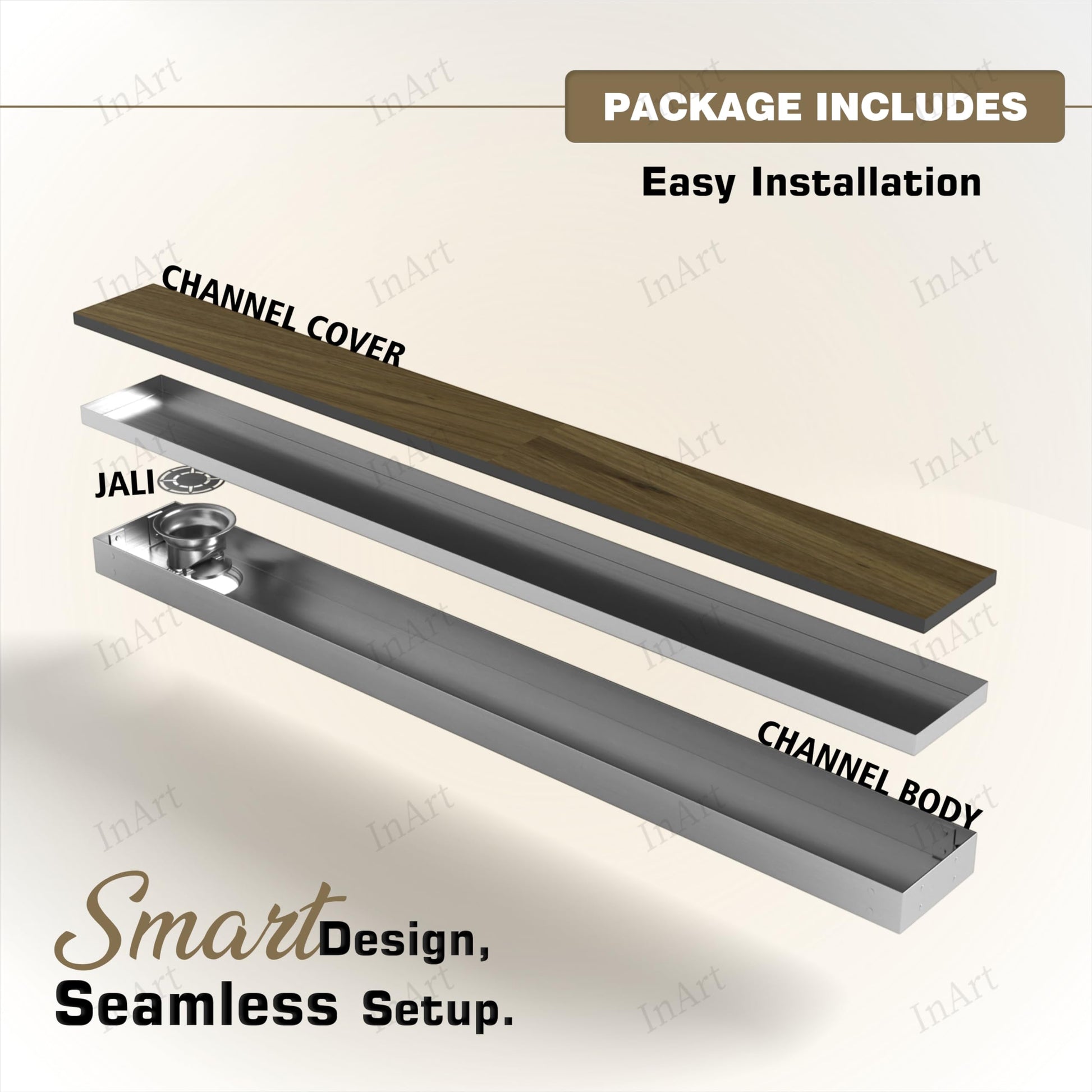 | Included Components | Linear drain channel body, reversible cover (solid + tile-in tray), removable odor trap/insert |