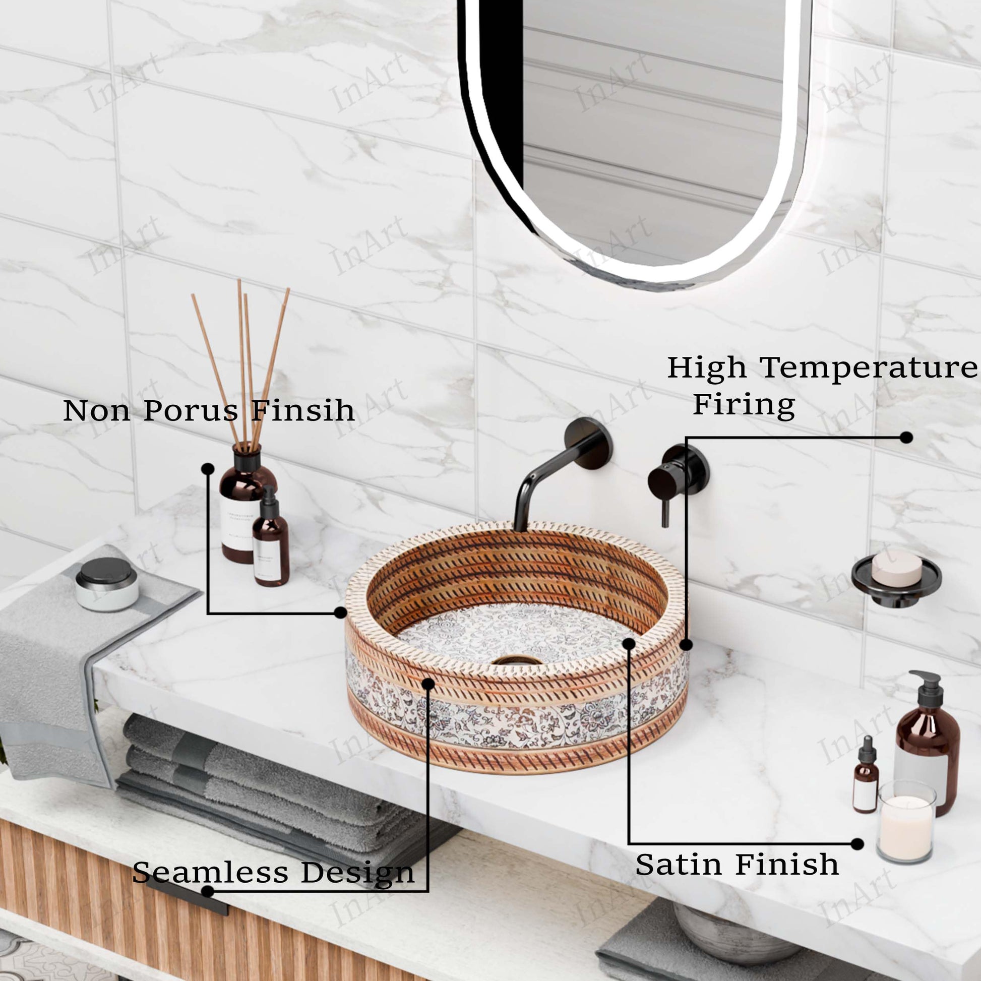 InArt Satin Patterned Ceramic Round Vessel Sink – Above Counter, 16" Moroccan Floral